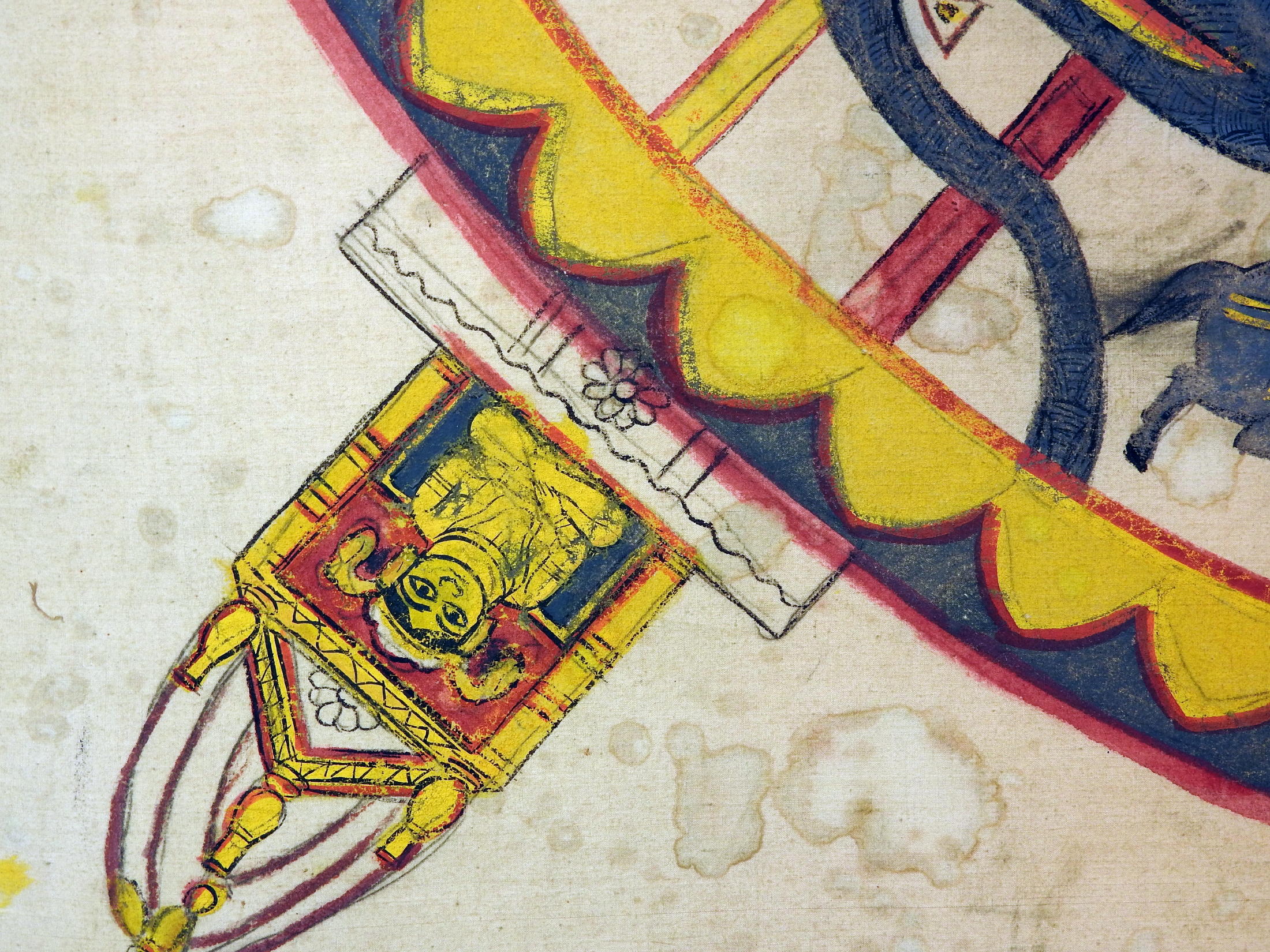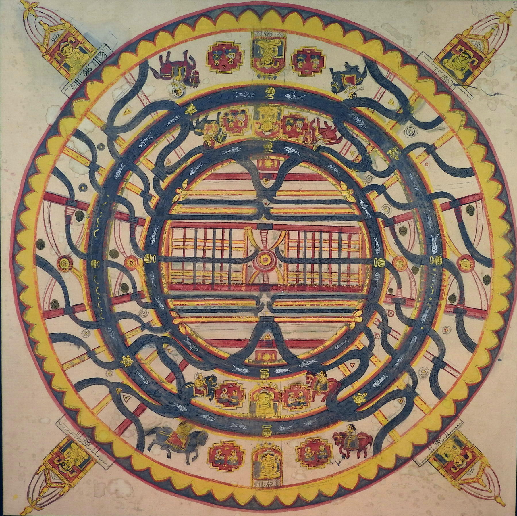 The Adai Dvipa is the so-called `Two-and-a-half Continent”, of which the central circle is the better known Jambhu Dvipa-continent. This is a typical Jaïn cosmographic diagram.