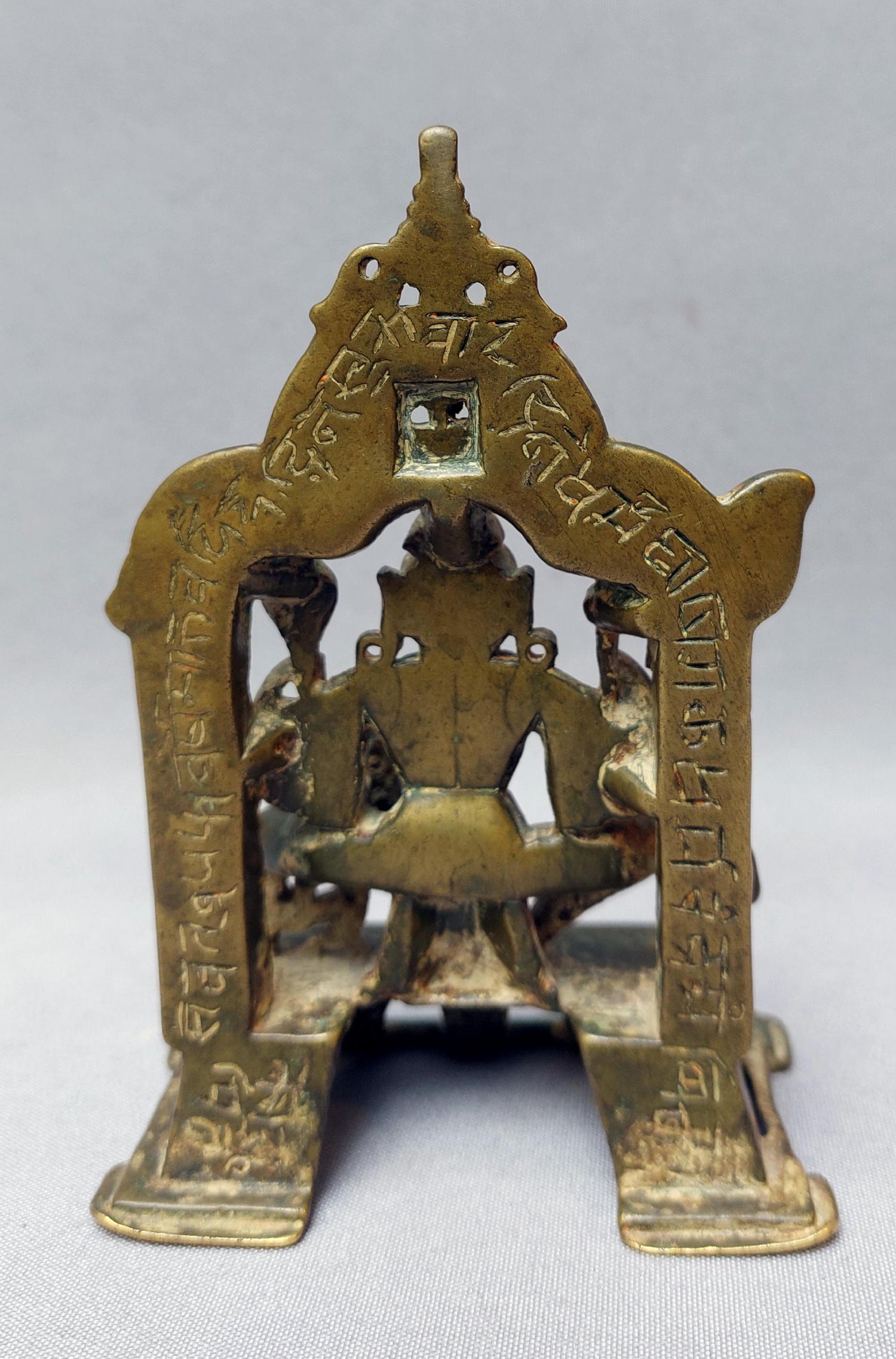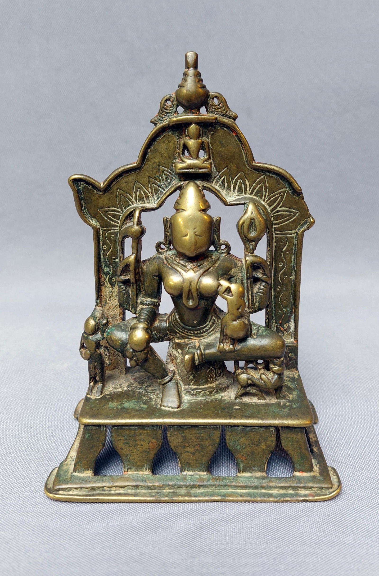 Ambika is a goddess who is considered as the protector of children, and belongs both to the Hindu as the Jain pantheon. This bronze clearly belongs to the Jain culture, shown by the small tirthankara in top.