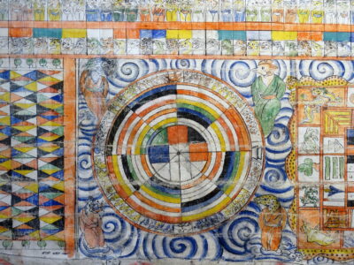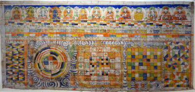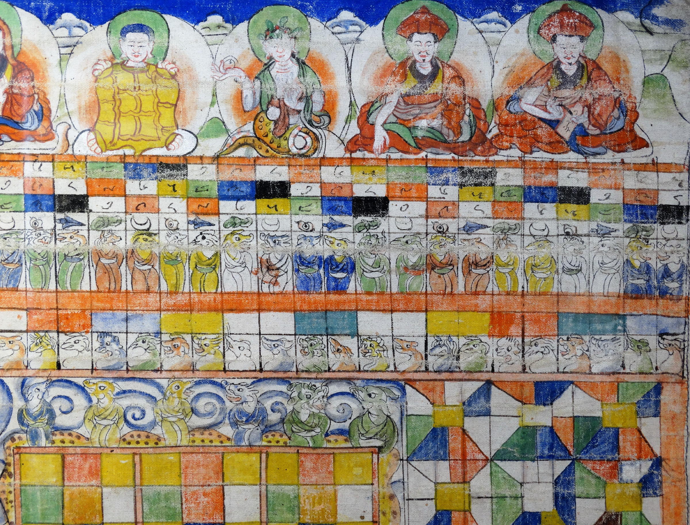 Very interesting scroll, with the usual astrological elements: depictions of the days of the week, the 12 monthes, the Trigrams of the I-Ching, the different color-combinations, etc. In top the different deities and lamas of the Drugpa-Kagyu-tradition of Bhutan.