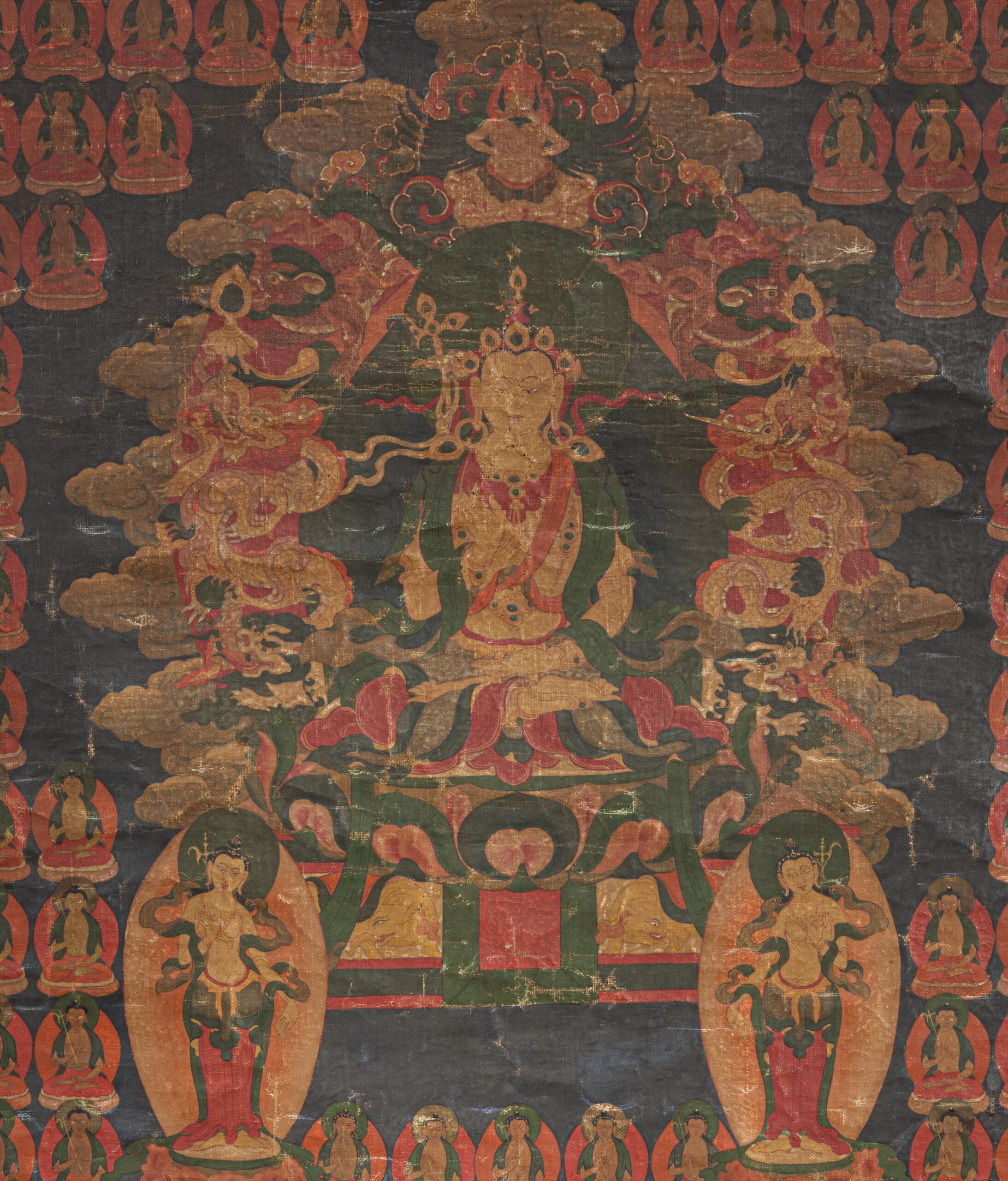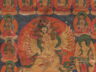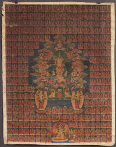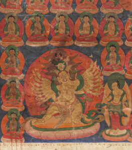 Central a seated deity, with in one hand his attribute, the elephant hook (ankusha). He is surrounded by nineteen rows of smaller depictions of himself (but in Buddha appearance), and flanked by two standing (female?) bodhisattvas, also holding ankushas. Below is a fierce protective deity, with the for the Bonpo-pantheon typical, animal heads.
