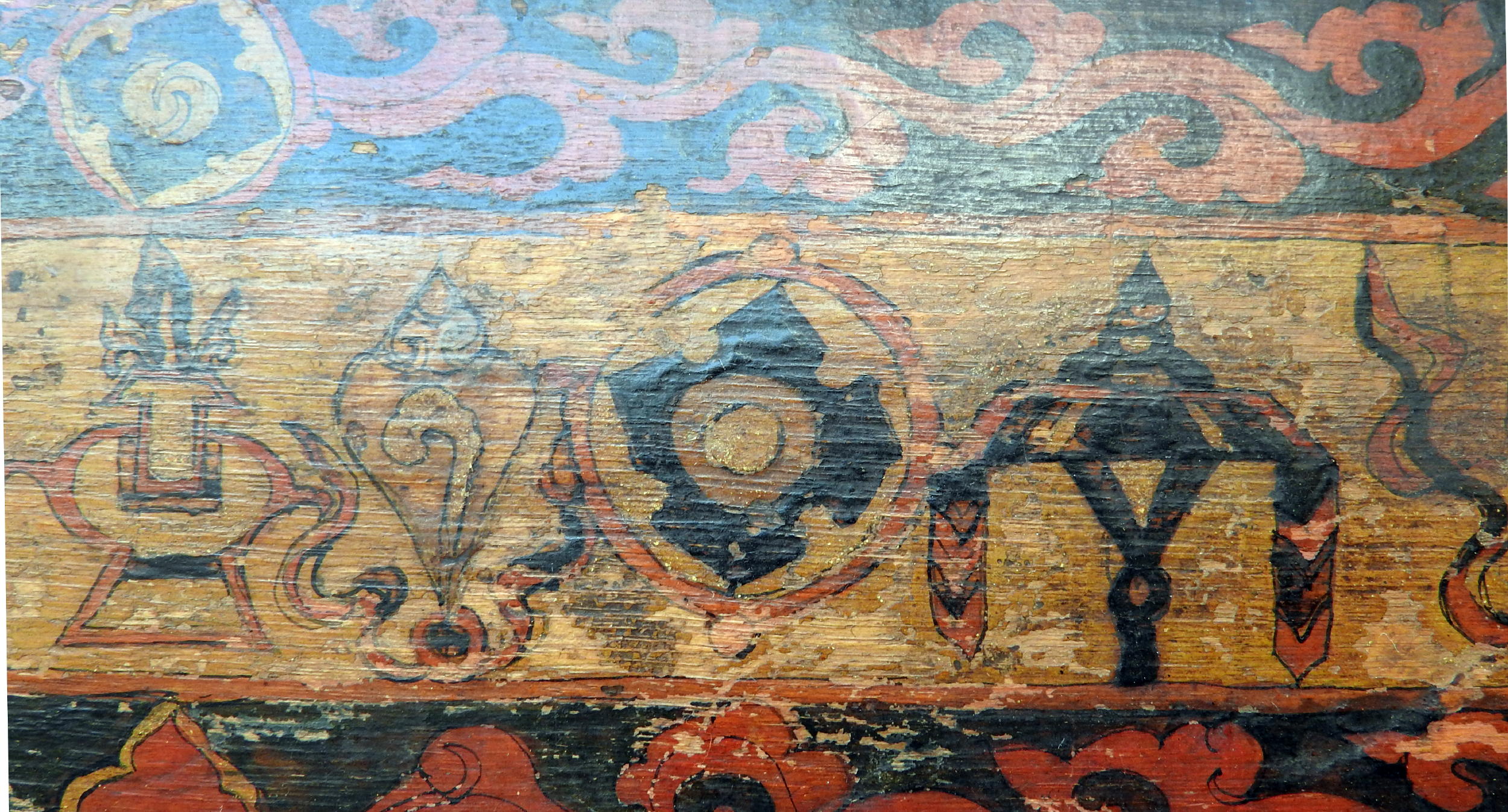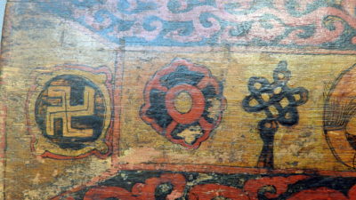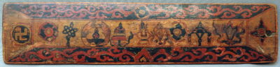 The cover is painted with the Eight Auspicious Symbols, slightly different from the traditional buddhist ones: prominently the Svastika, and a different shape of the Chakra (wheel).