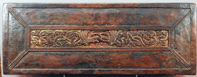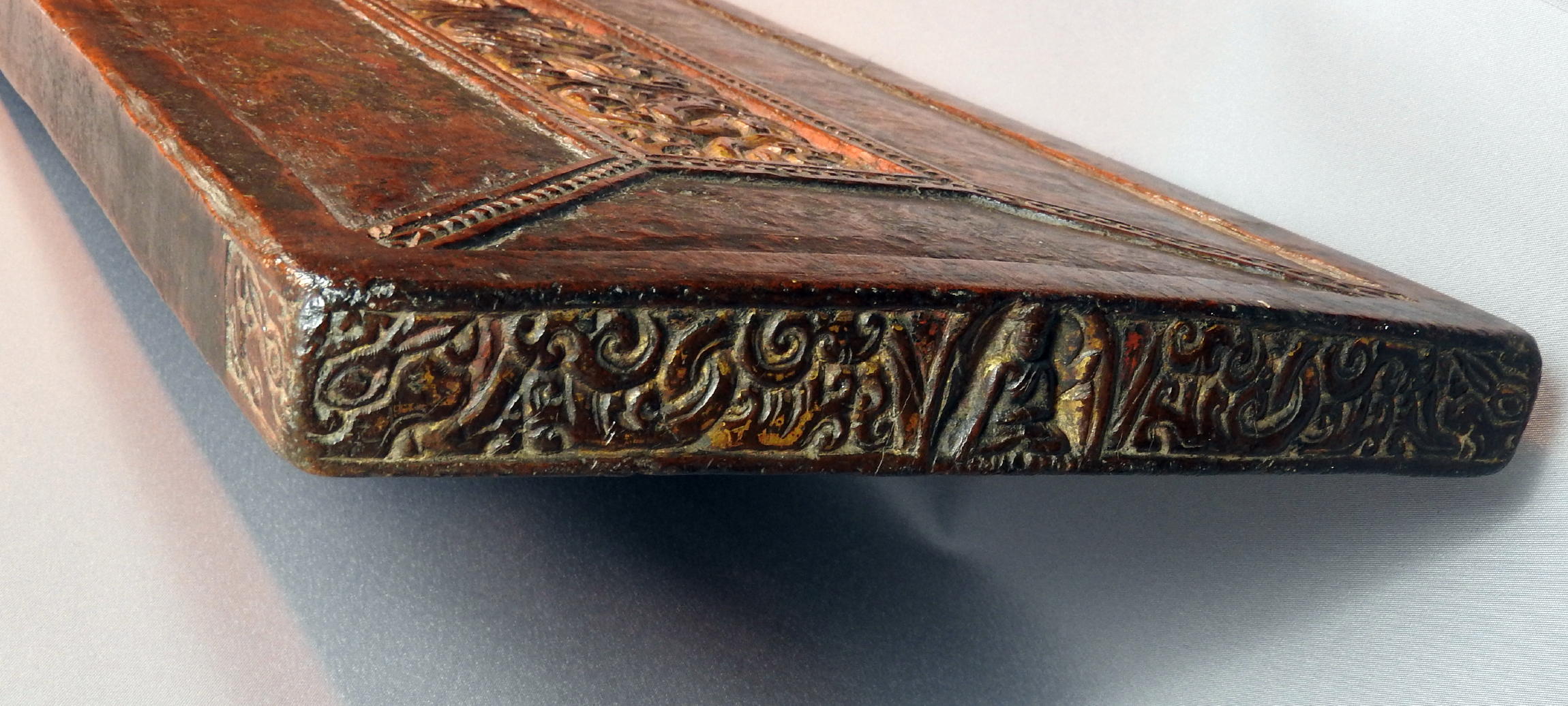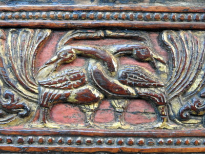 large and heavy bookcover. In the center the two birds (peacocks or geese?), with their necks intertwined; this is an old central-Asian motive, found frequently in Tibetan wood- and metalwork.