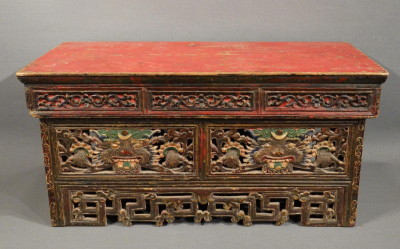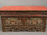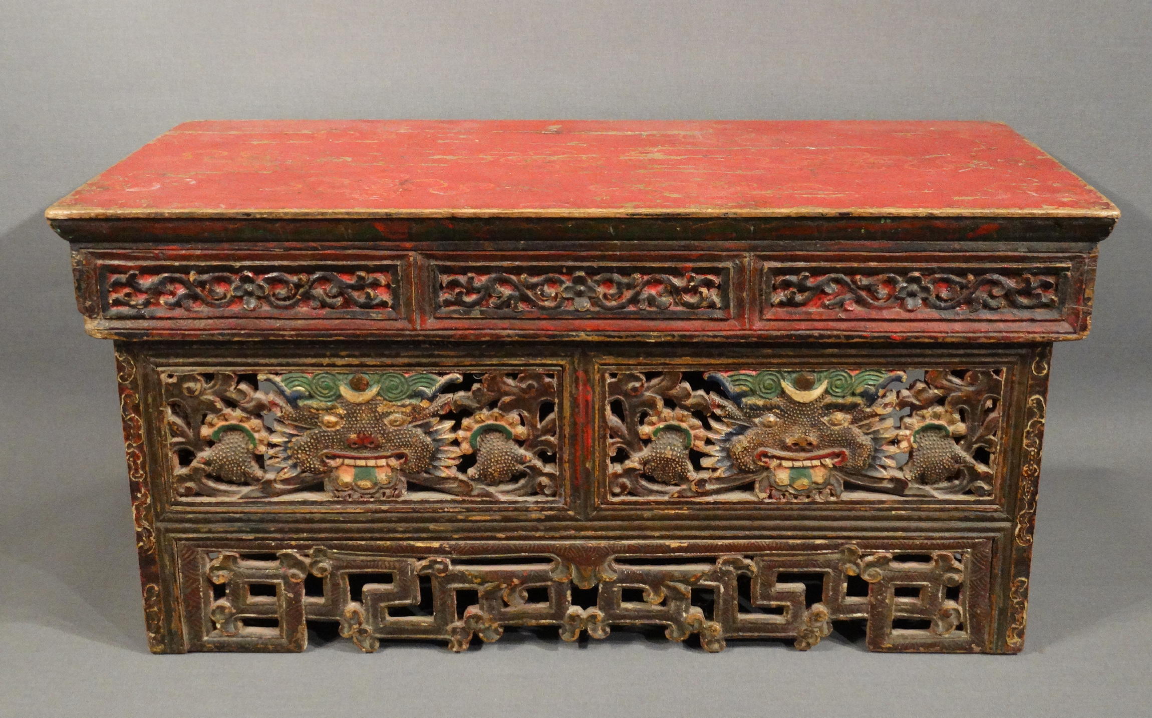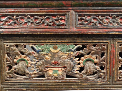 The two front-panels depict kirtimukhas, horned monster faces, derived from the original Garuda/Khyung, eating a snake, that they hold in two hands. On their head a sun-moon-symbol.