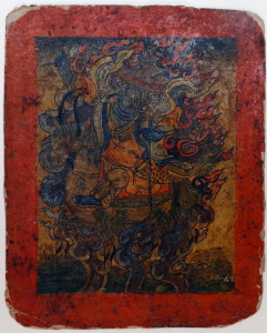 Garwa Nagpo, the `Blacksmith Deity’, is recognizable by the goat he is riding on; in his hands a hammer and a banner.