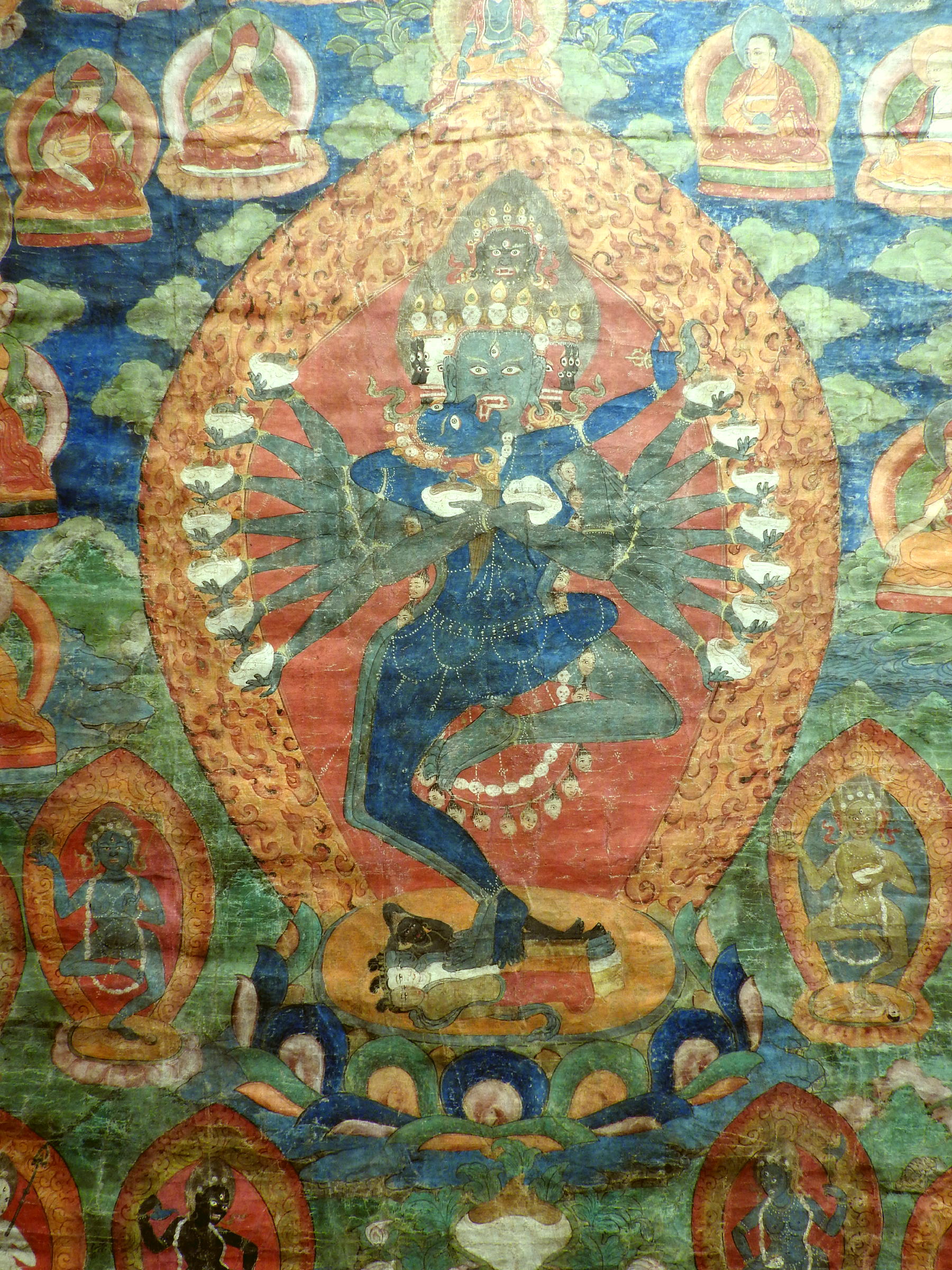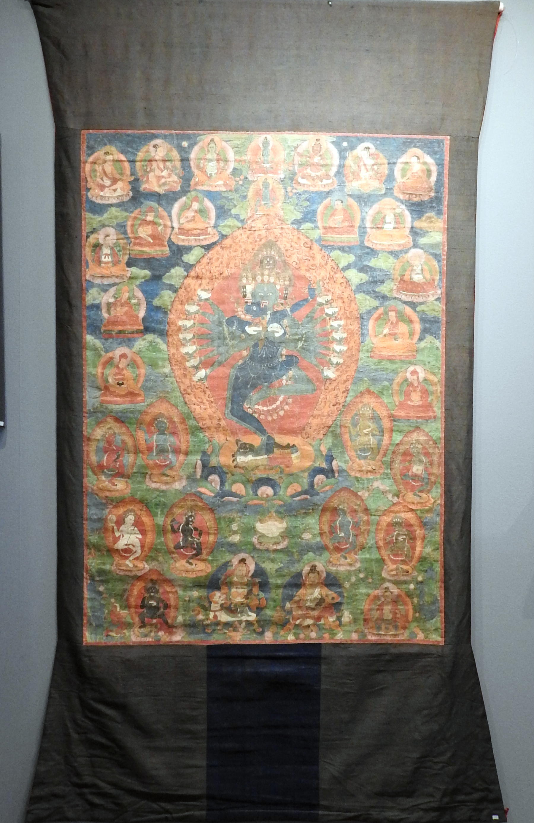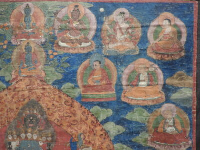 Hevajra is the specific deity of the Sakya tradition. This thangka is of this tradition and shows the different high lamas of the Sakya.