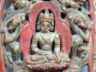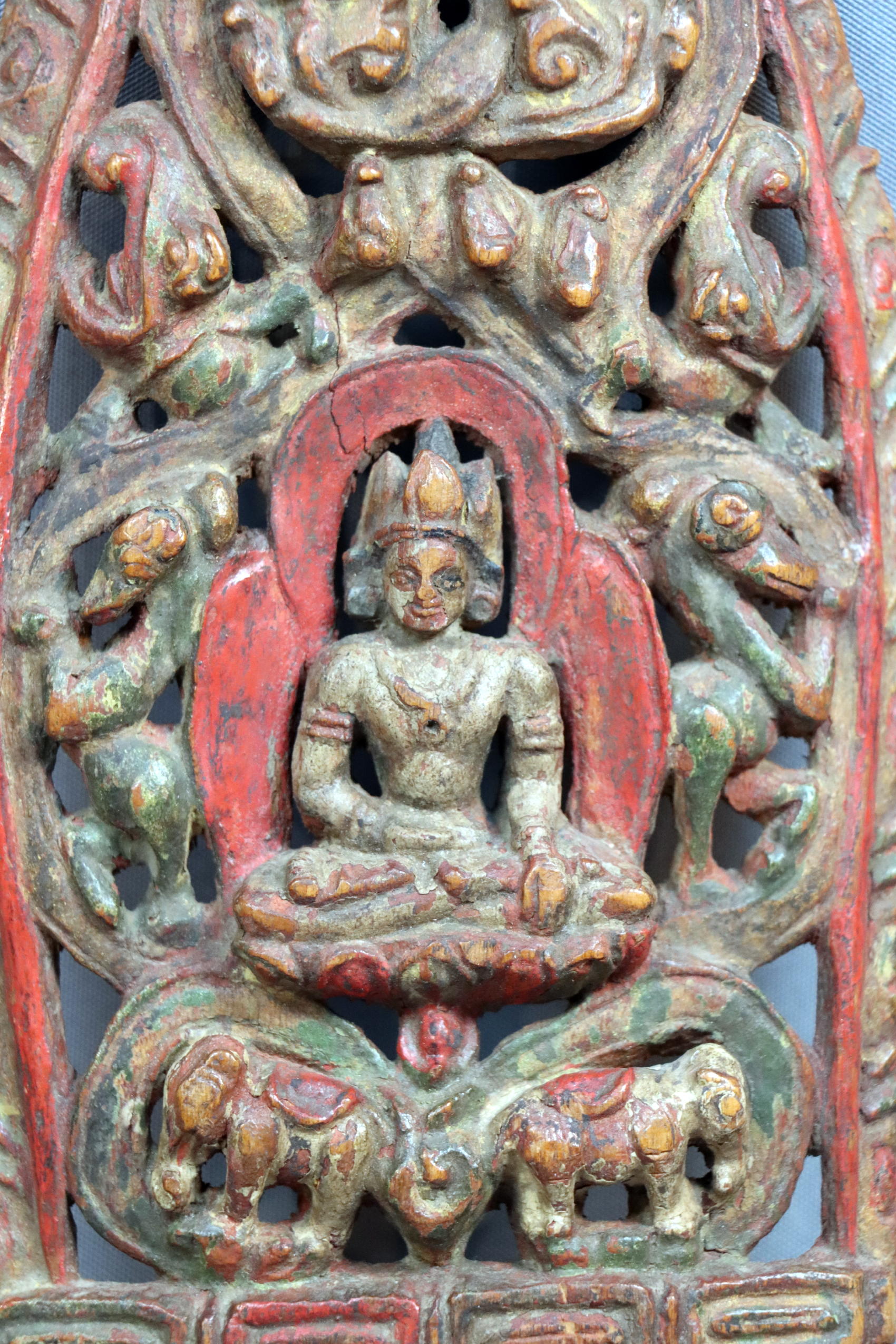 A very rare carved and painted leave of a ringga, decorated with a seated figure of Buddha Akshobhya on a throne supported by two elephants and surrounded by an elaborate prabhamandala, crowned by a Kirtimukha. Note that the Buddha is depicted mirror-wise!