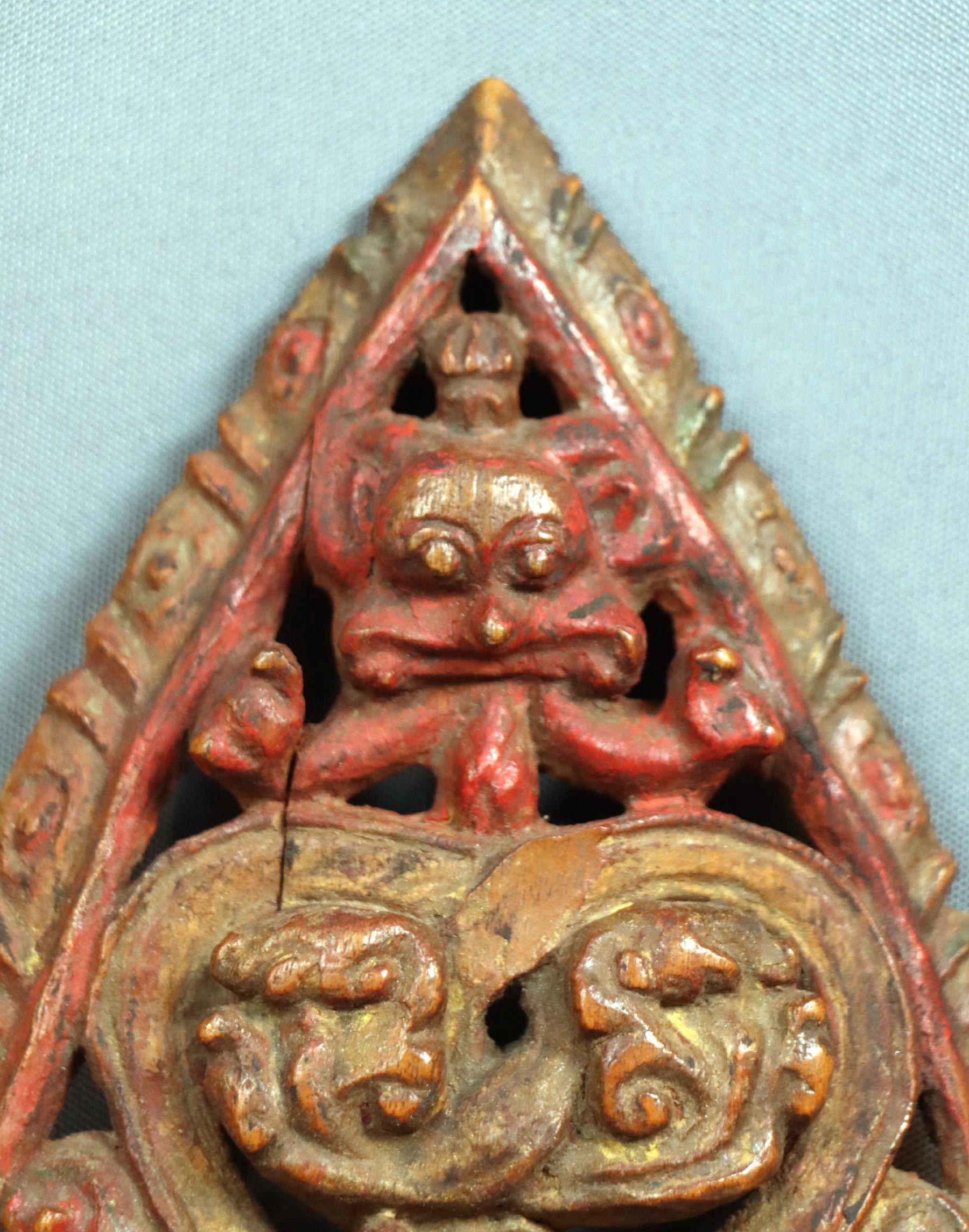 These leaves, made of wood, are extremely rare: already Giuseppe Tucci, in The Temples of Western Tibet and their artistic Symbolism, the Monasteries of Spiti and Kunavar (Indo-Tibetica III, 1), New Delhi 1988 (first edition 1935), p. 80-82, writes: `the more antique ritual crowns are made of wood, according perhaps to the India habit …..; they have today become rare beyond measure’.