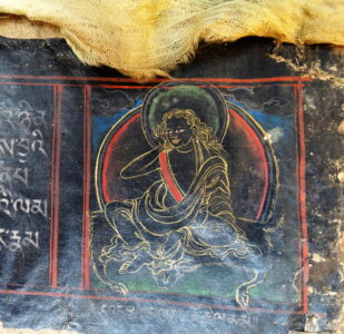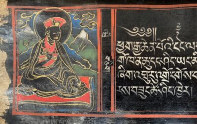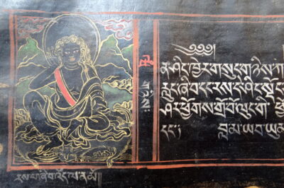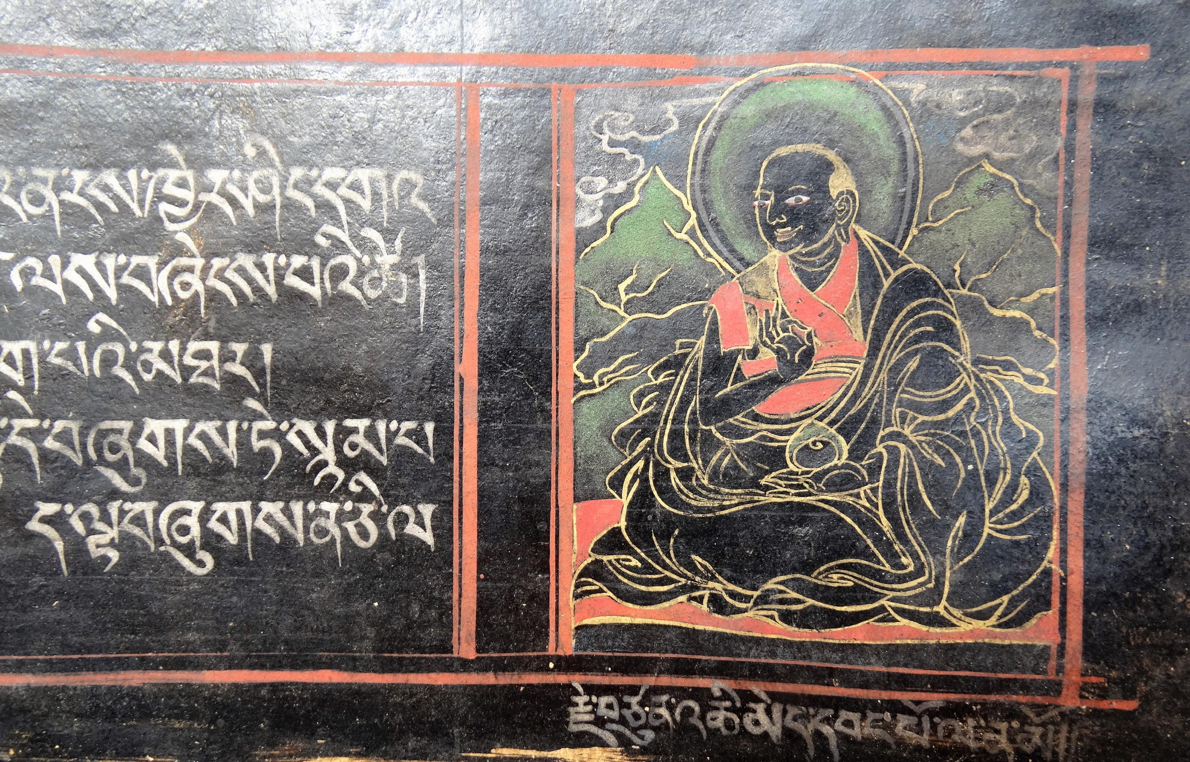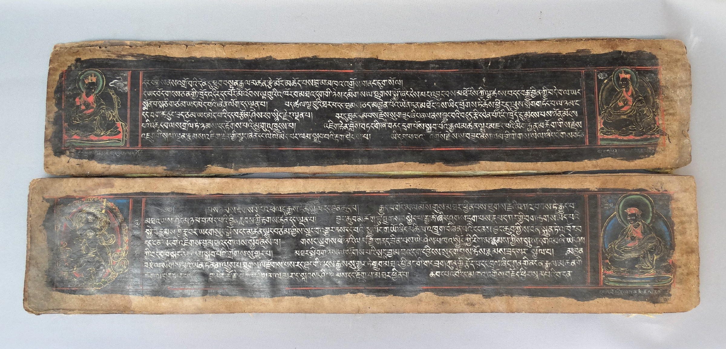 Nice manuscript on Kagyu-masters. In fact there are two books: one of ten leaves, and one of eleven leaves, each with a titelpage with yellow silk front. The illustrations depict Kagyu-masters, with Milarepa prominently displayed.