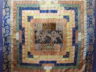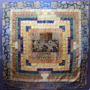 Chinese brocade appliqué, the centre embroidered with gold-thread