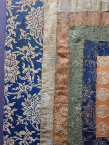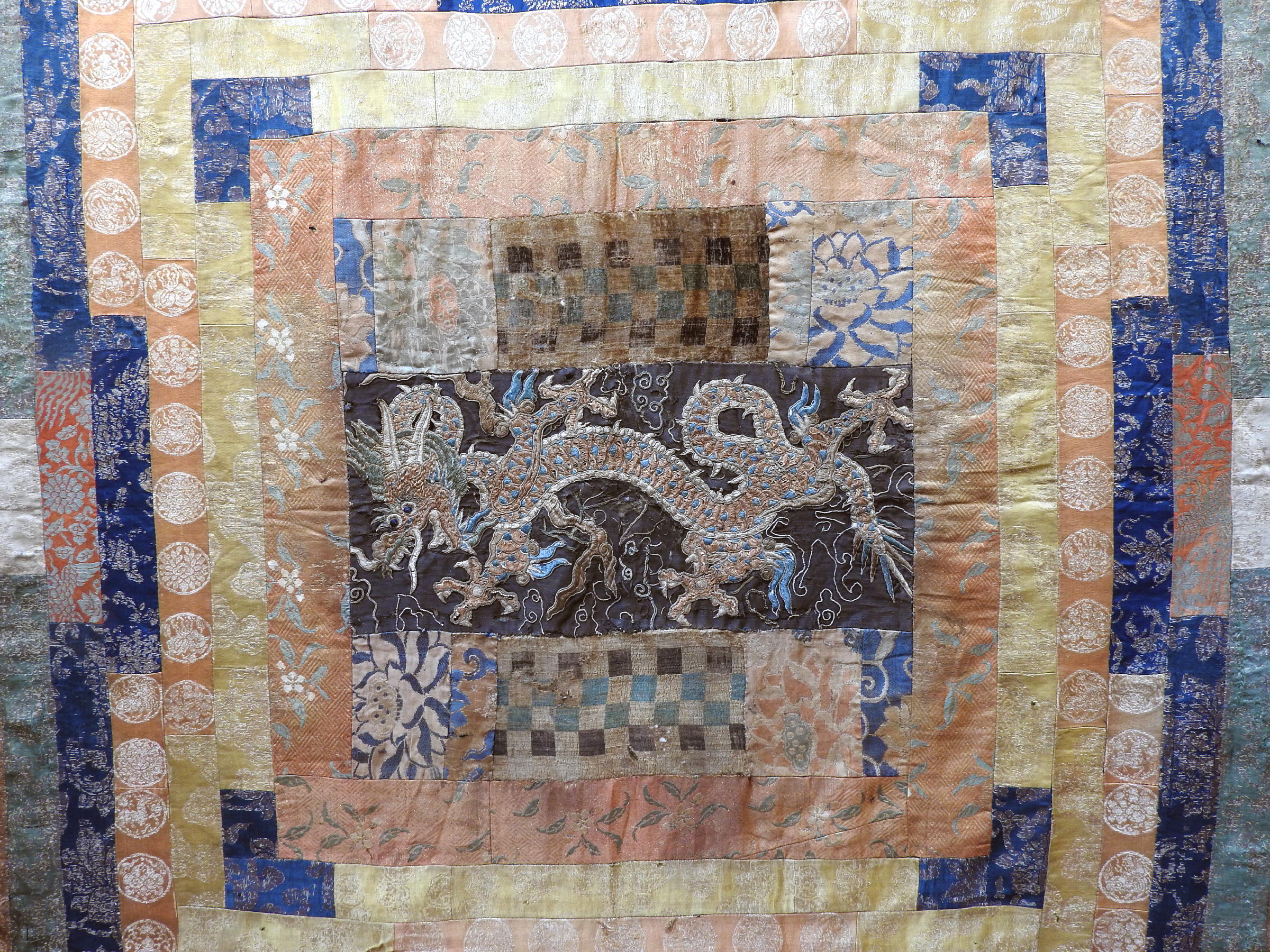 All silk brocade pieces, and the embroidered dragon, date from the 16th-17th cent.