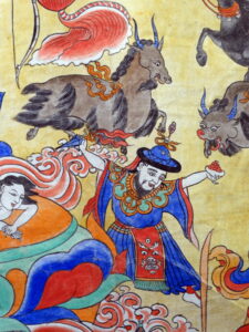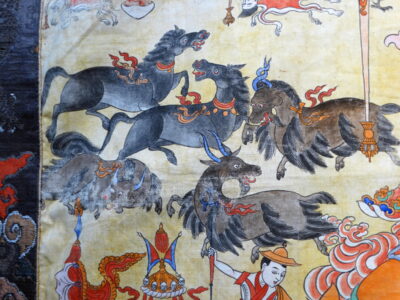 This thangka belongs to a larger series, depicting the projections of all the Dharmapalas, belonging to the Gelugpa-tradition.