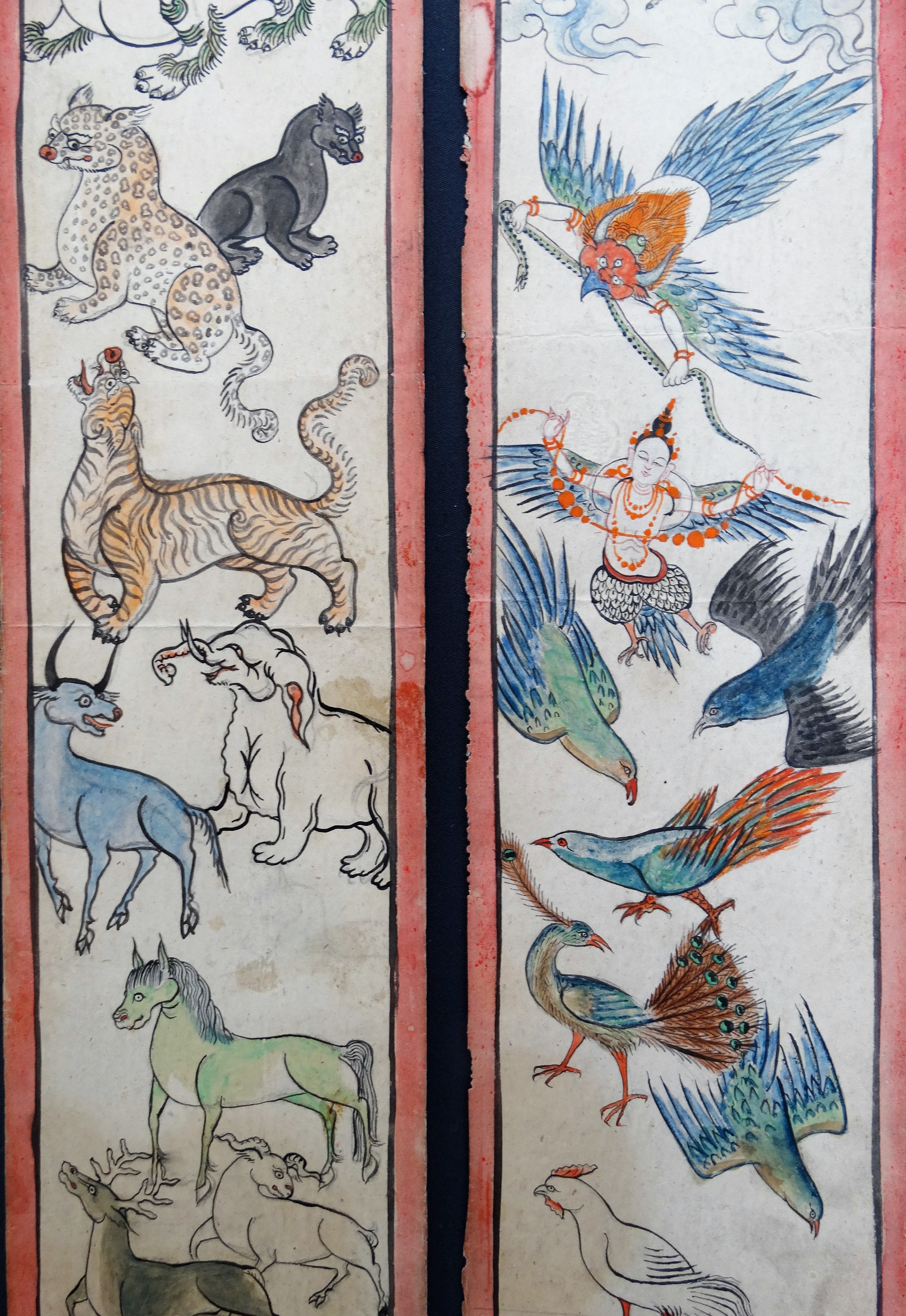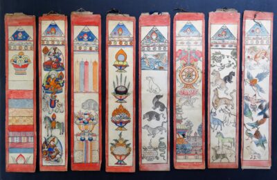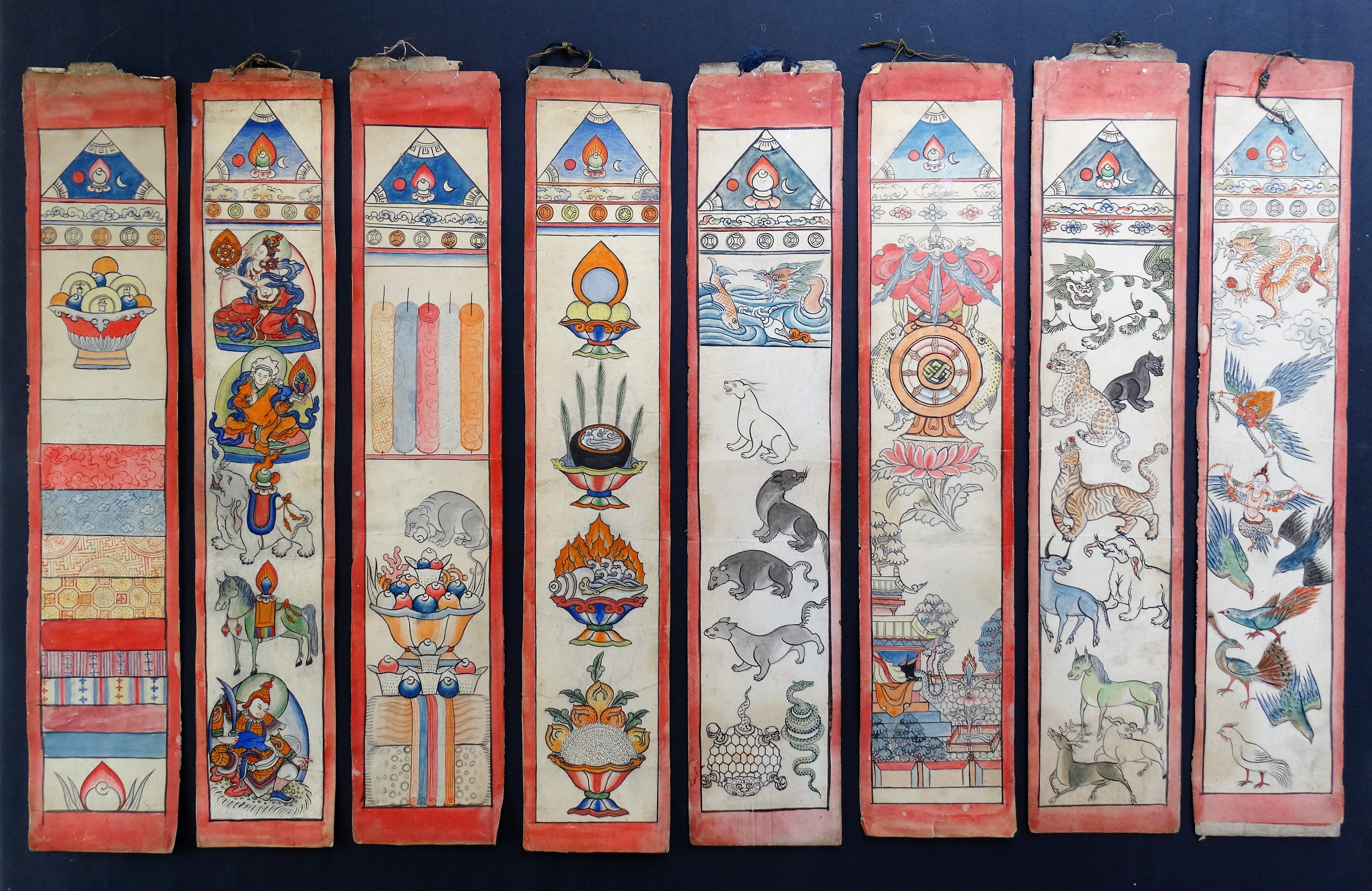 These eight strips belonged to a larger set and were meant to hang on the wall during ceremonies. Very nice and interesting drawings!