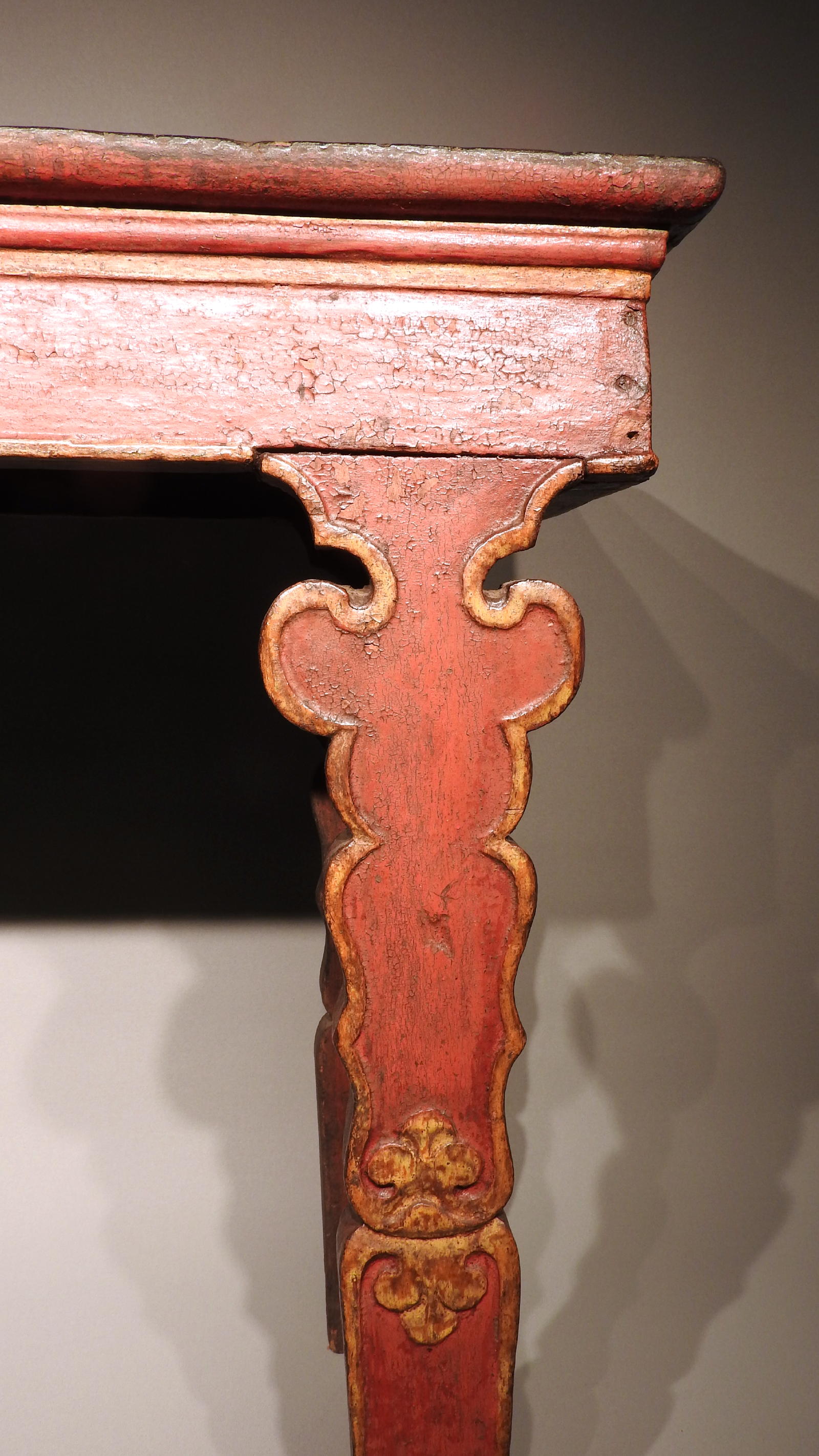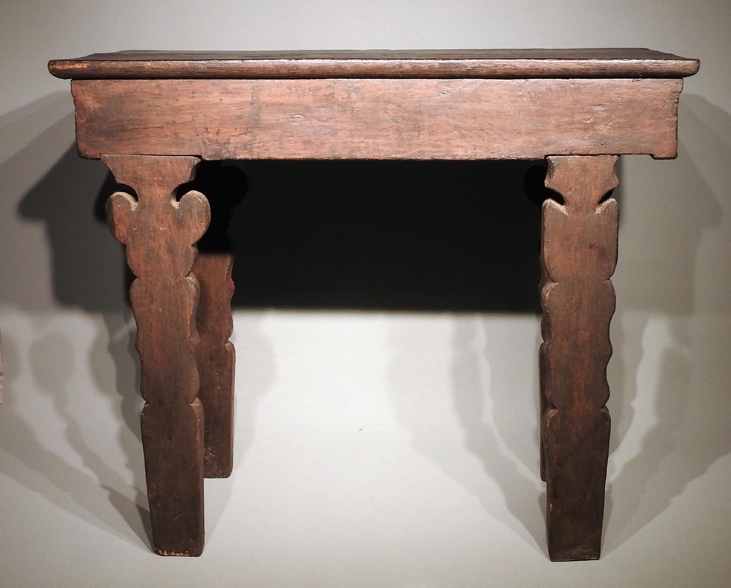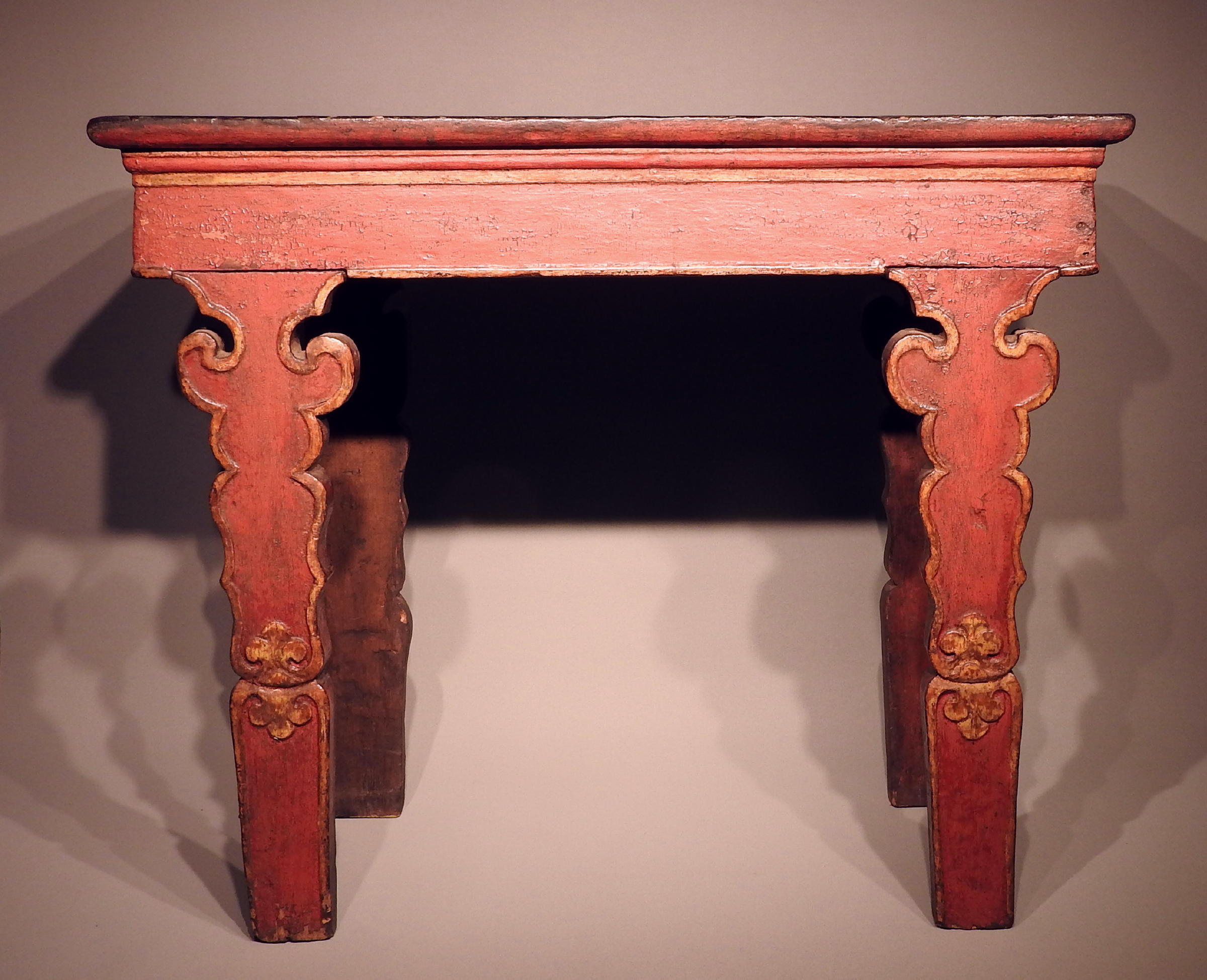 Very elegant table, with unusual high legs. This table, especially the decoration on the legs, is remarkably similar to a table, although with shorter legs, illustrated in David Kamansky (ed.), Wooden Wonders, Tibetan Furniture in Secular and Religious Life, Pasadena/Chicago 2005, p. 181 (nr. 4), also dated 15th-16th cent.