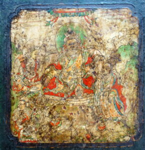 Depicted are, with a seated King in the centre, the Queen, the Minister, and below the general, elephant, horse, jewel and wheel of Law. As the Saptarana are the seven offerings to the Chakravartin, the Buddha as a wordly ruler, the depiction of a king the centre is logical. This panel must have been part of a piece of furniture, like a cabinet.