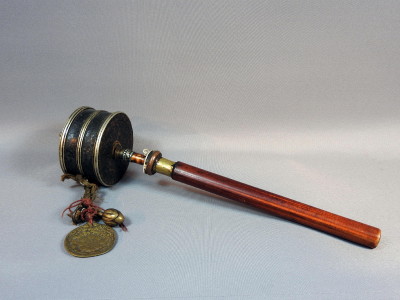 beautiful old prayer-wheel, with an old astrological calendar and a tokcha attached