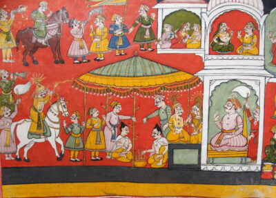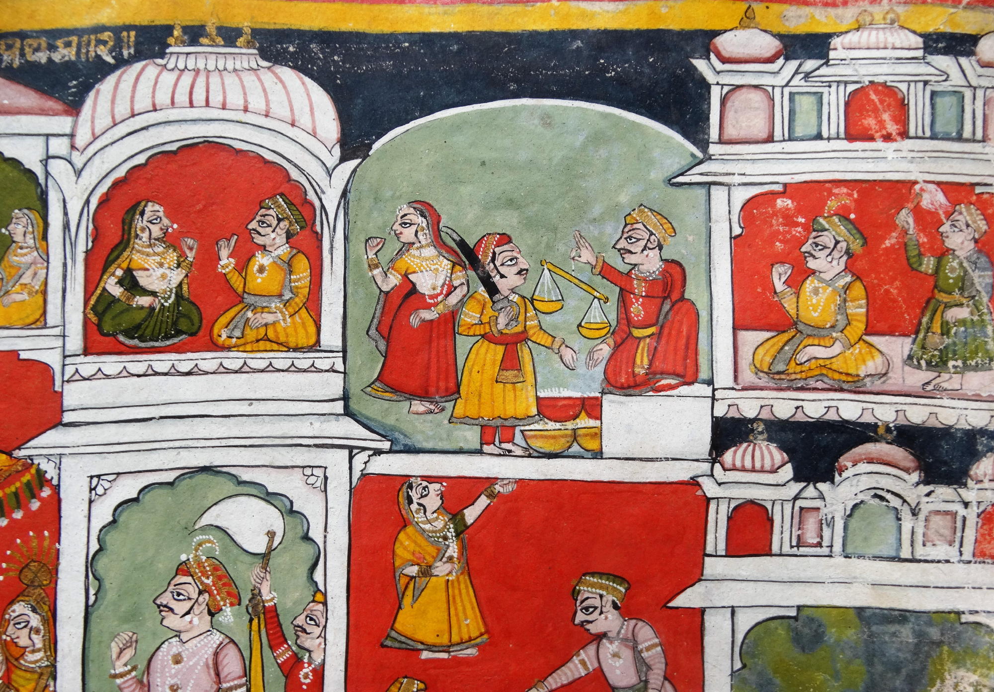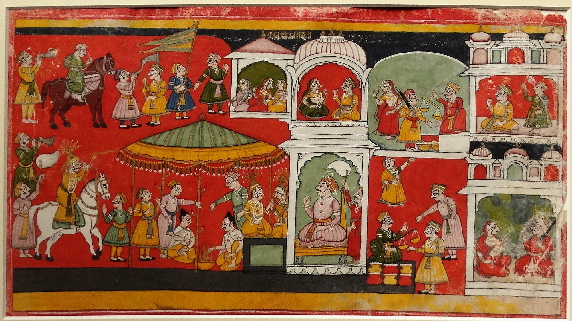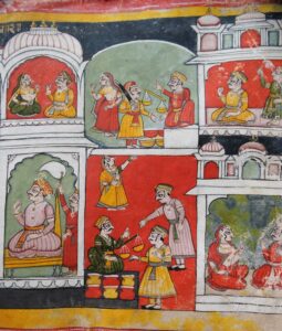 The local Hindu kingdoms of Western and Central India were slowly annexed by the Moslim Moghul empire. The small kingdom of Malwa had to move its capital in around 1700 to the newly build city of Narsinghgar, were a new style op court-painting developed: so became the size of each leave more oblong.