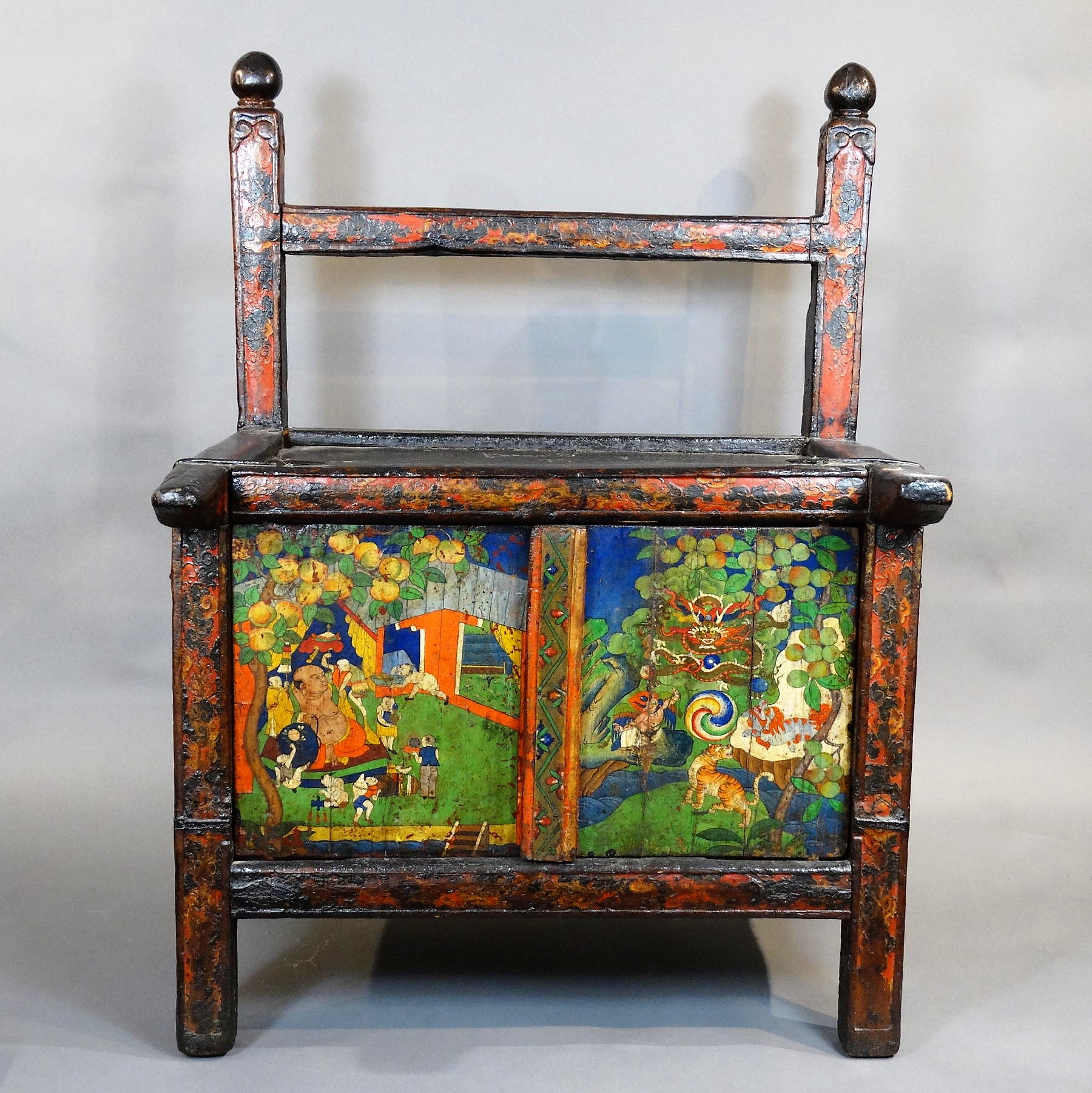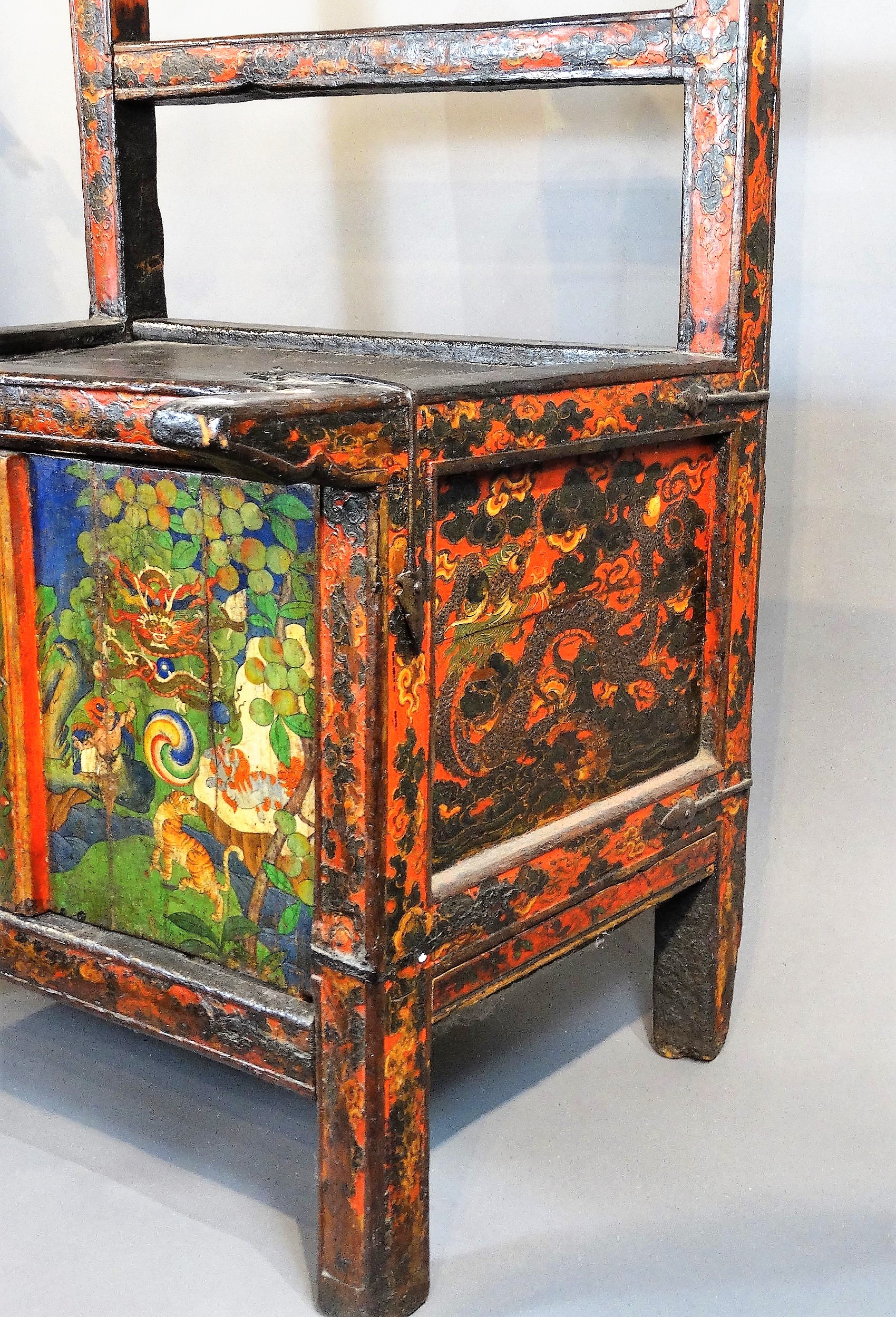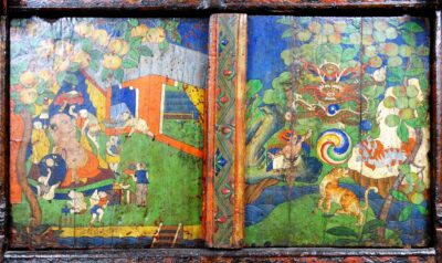 A pegam is a small cabinet/table, used by monks to read the books. In this case the two front-doors are painted gaily with (left) the Allegory of the Cooperation, and (right) the Six Symbols of Longlife (Tsering Drug).