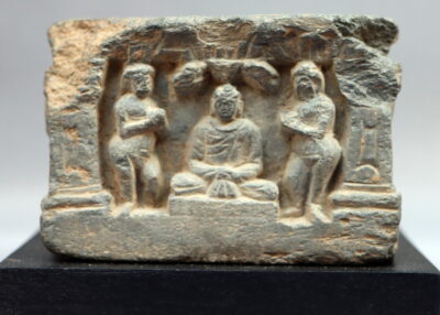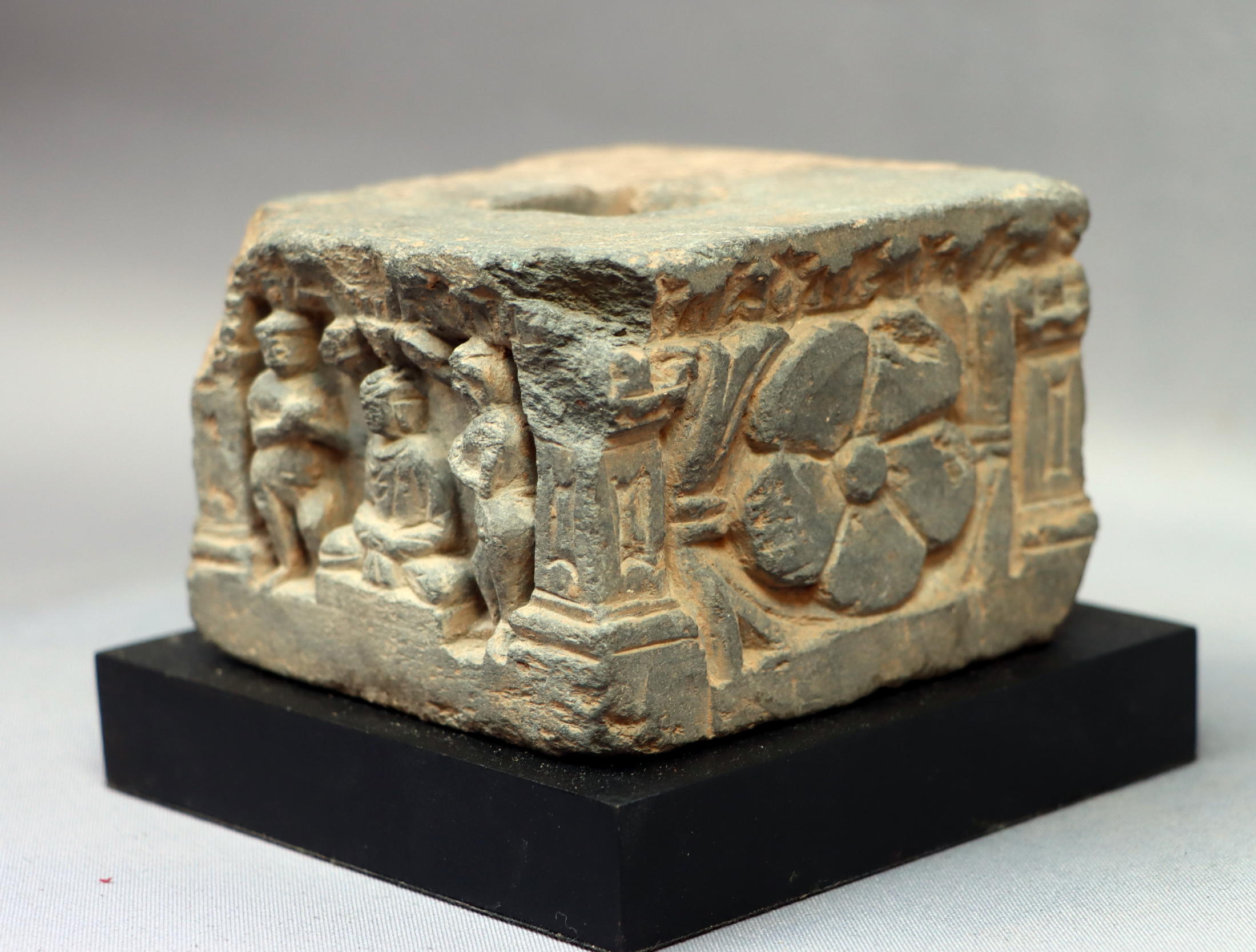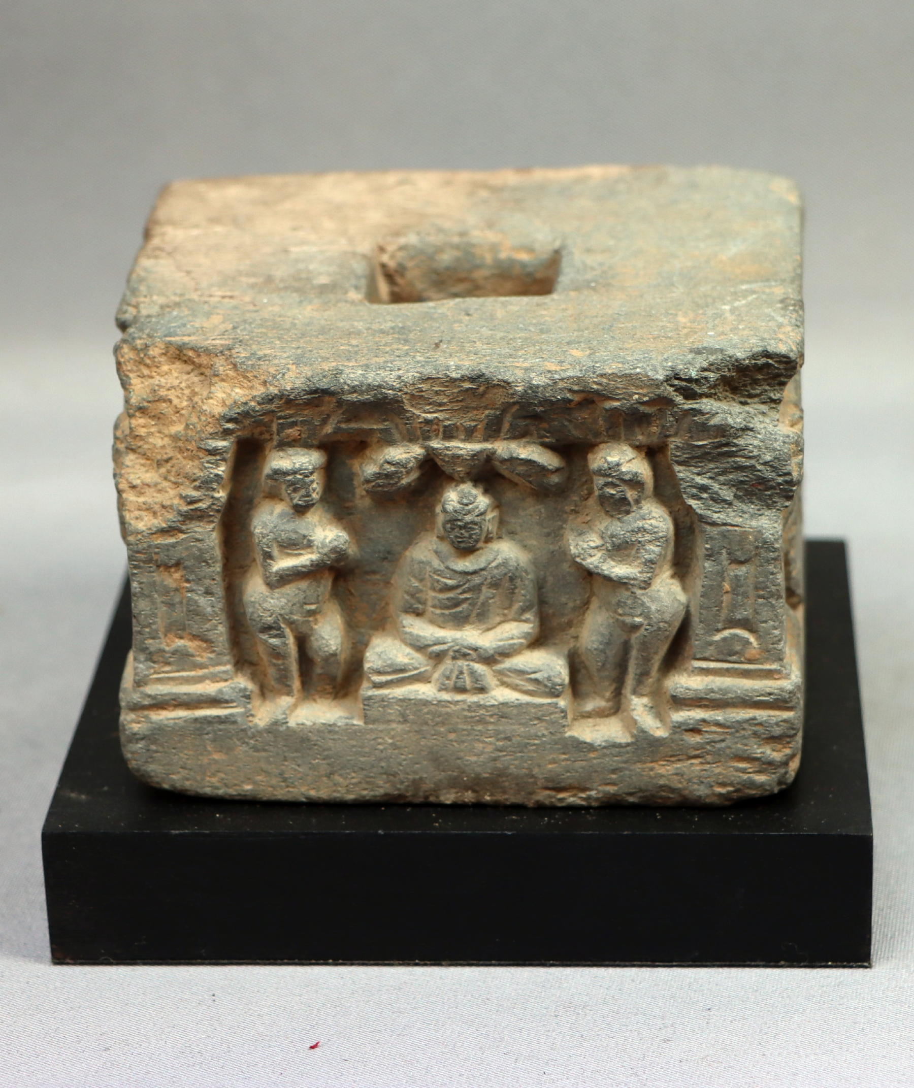 Small square base, with a relief of a seated Buddha with two devotees on one side. The other sides are decorated with one central flower