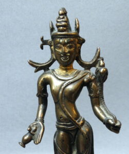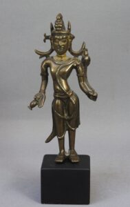 Cast in the typical style of Western Tibet (former Kingdom of Guge), or the western Himalayas. He is recognizable by the small pot above his left shoulder. On his face traces of cold gilding. In his hair a small effigie of the Buddha Amitabha, his spiritual “father’.