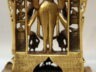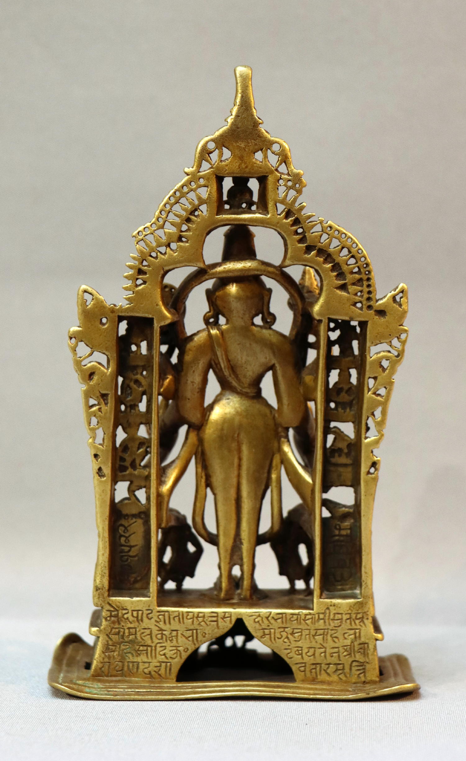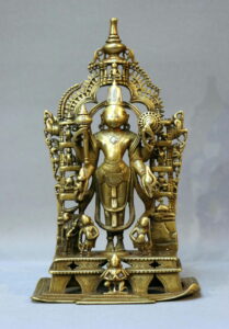 Beautifully cast bronze, with rich silver inlay. Vishnu stands with four arms and, in his hands, his traditional attributes. Behind him left and right, six of his 10 Avatara. At his feet are the four Purushas (the small figures that originally carried his weapons; one is missing), and below Garuda. Very detailed prabhamandala, with a small figure on top.