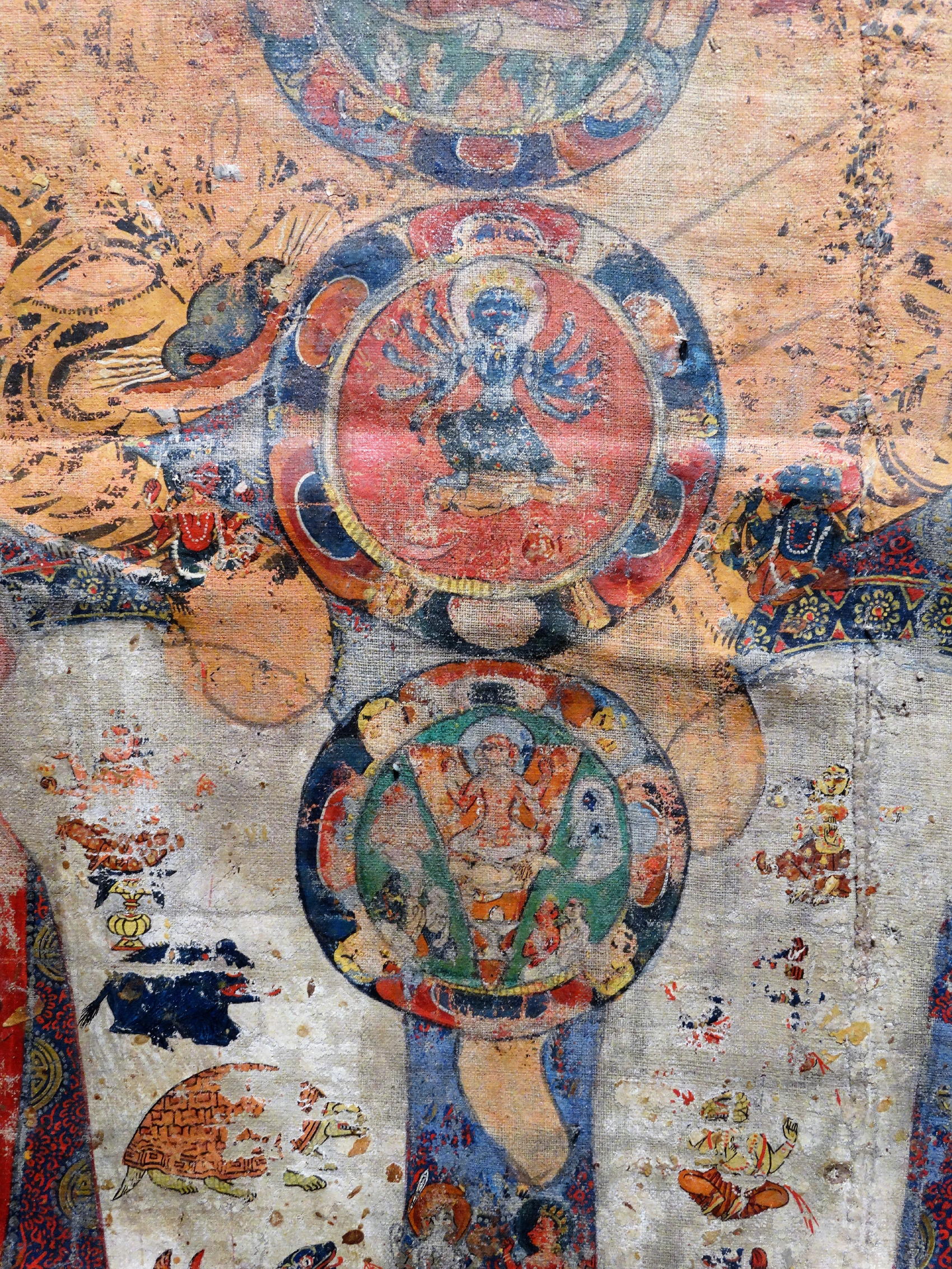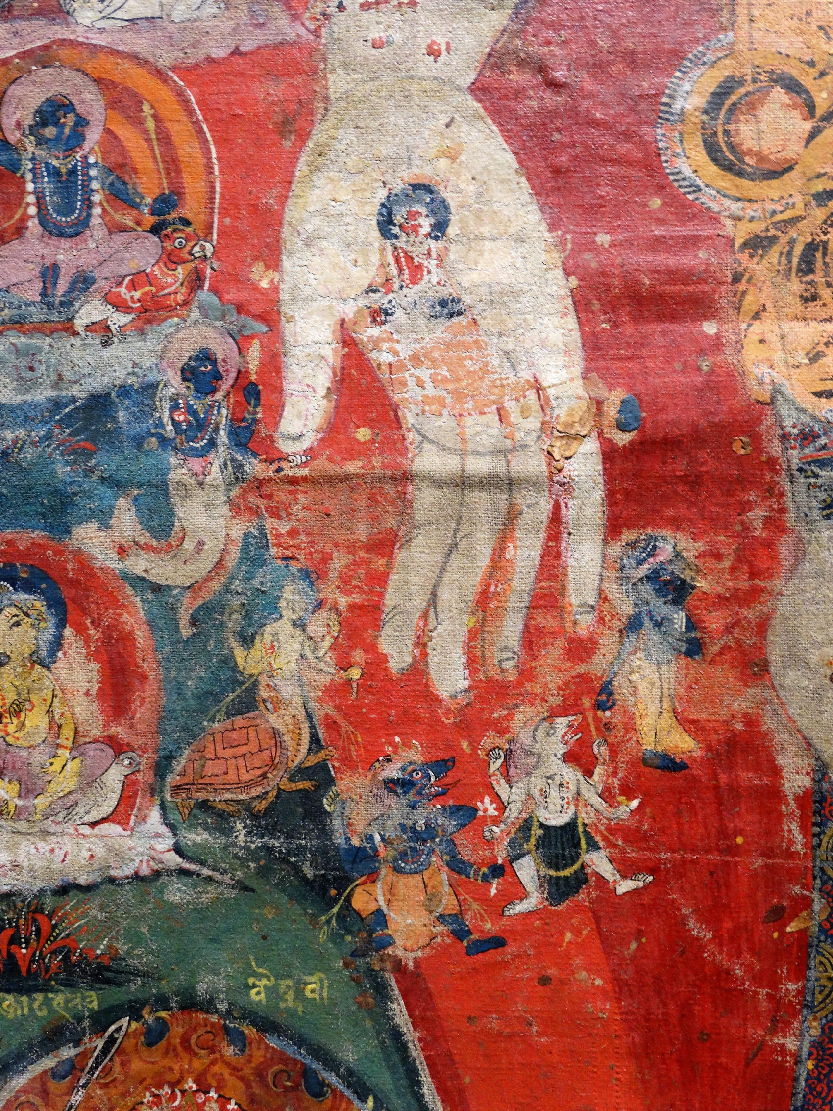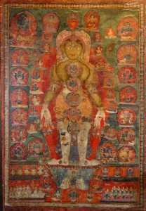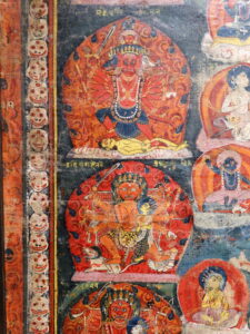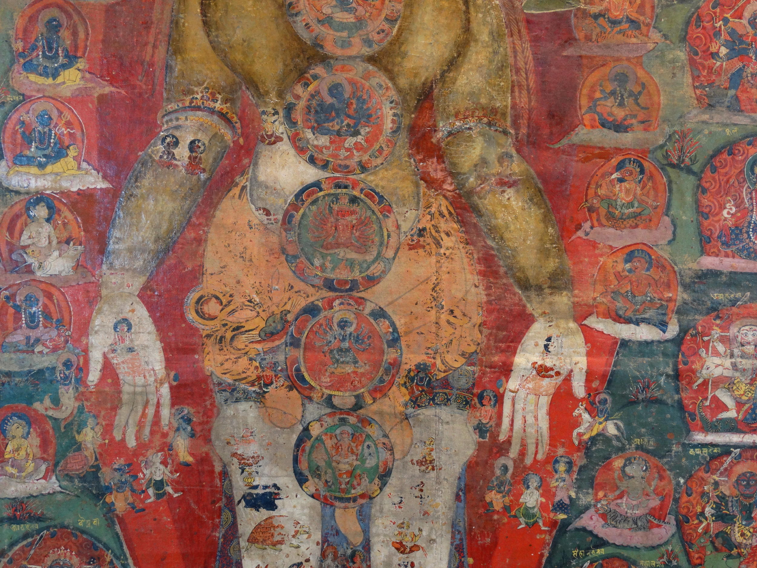 Extensive inscriptions with all the depicted deities, and descriptions of the different chakras. At the bottom the names of all the donor-figures.