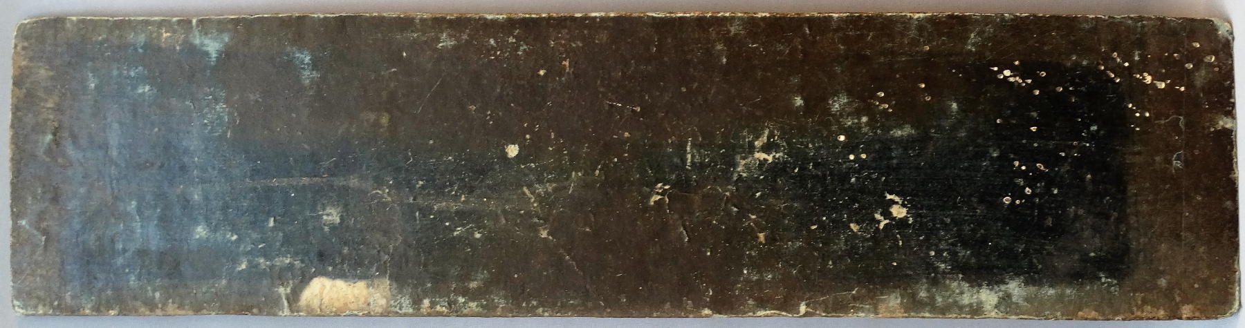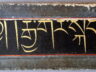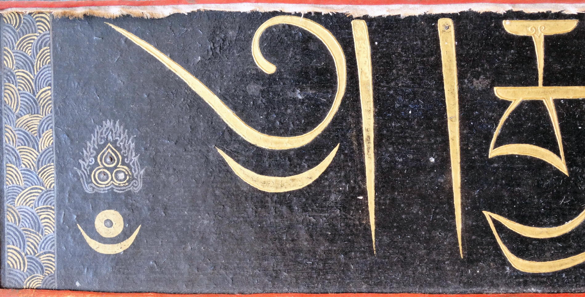 The titelpages of manuscripts are always thicker, most of the time a couple of pasted paper leaves. In the center is a recessed rectangle, with the common starting text: rgya gar skad du, which means: “written in the Indian language’, i.e.: translated from the Sanskrit.
