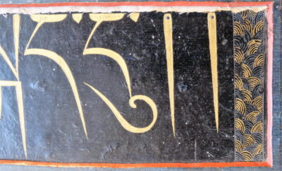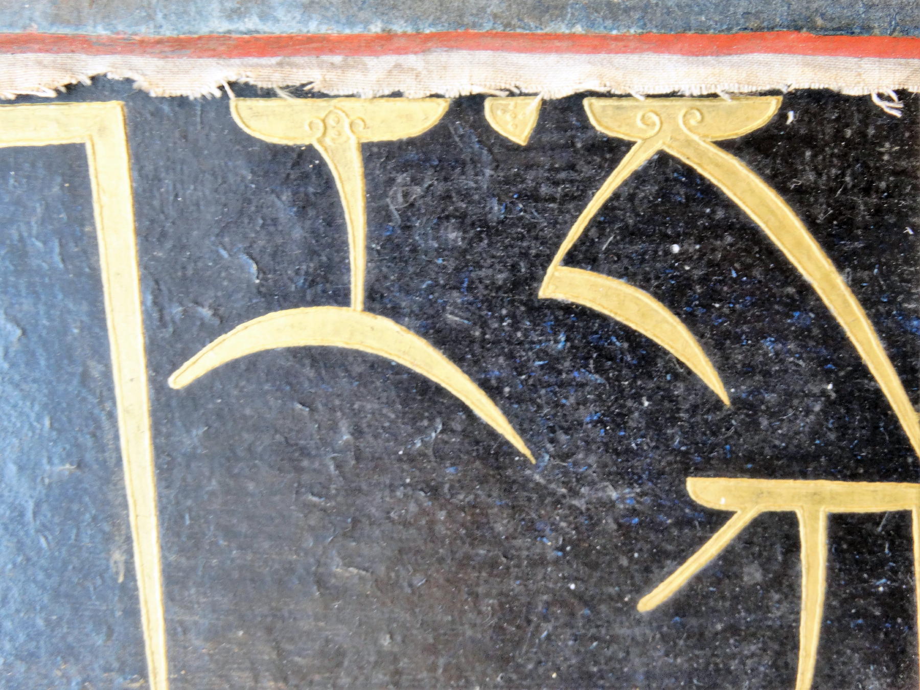 In this case the text is written with gold-paste on indigo-blue-background. The caracters in gold-paste are decorated with thiny, very subtle details.