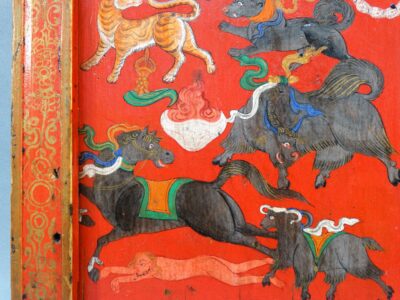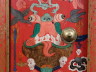 This torkam is meant for the offerings to a fierce Dharmapala, and is painted with fantastic tantric offerings, like the Offering of the Five Senses, in a kapala.