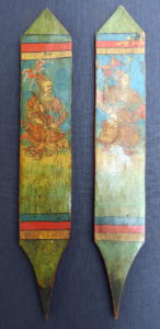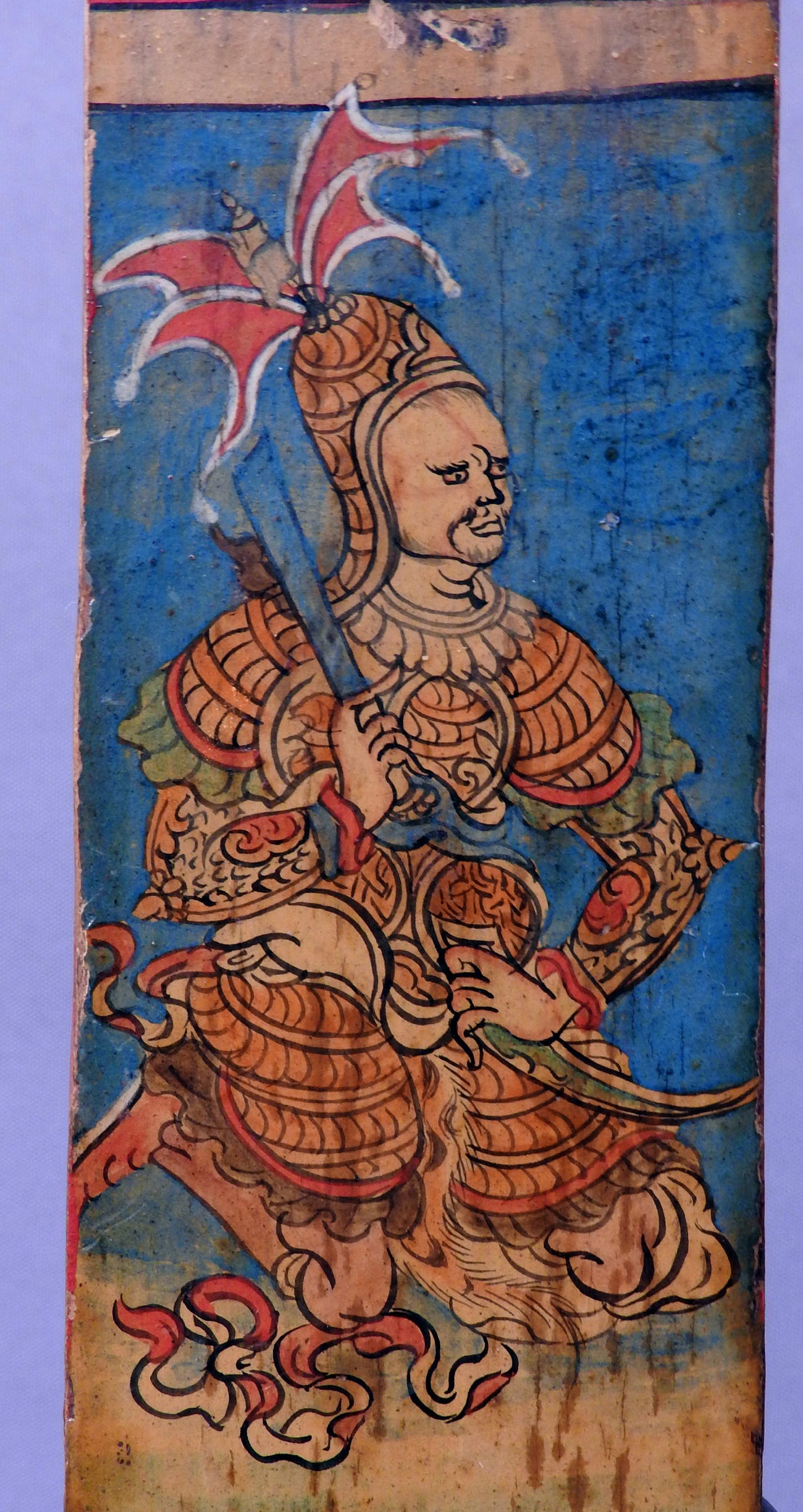 This kind of sticks were used to put in a low tray, filled with tsampa. Depicted are a general, one of the Saptaratna.